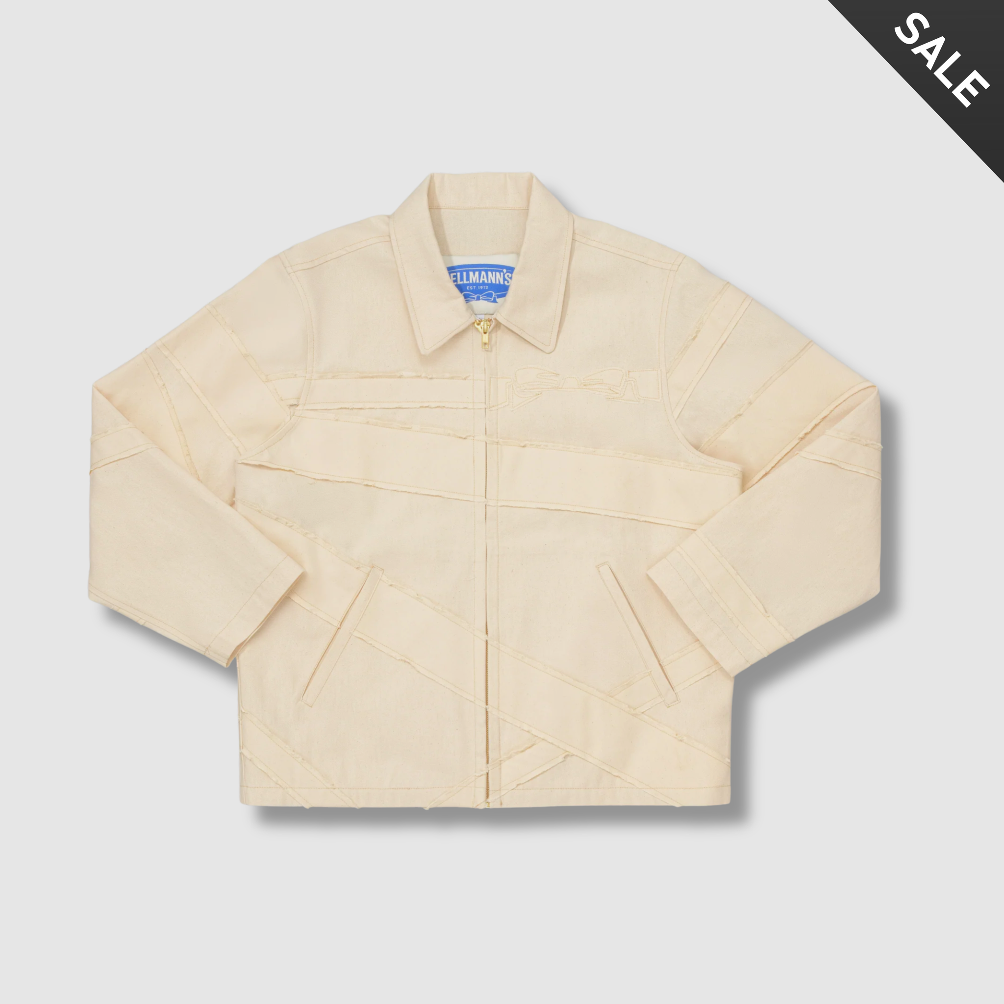 Crafted from natural cream bull denim, a durable cotton fabric with a smooth, refined finish, this classic zip-up is stitched with a cream-on-cream ribbon appliqué that brings Hellmann’s iconic bow motif to life. Rich in detail, finishing touches include an interior label bearing the Hellmann’s wordmark in tonal embroidery and a flash of bold blue beneath the collar that adds a crisp contrast to the cream foundation.