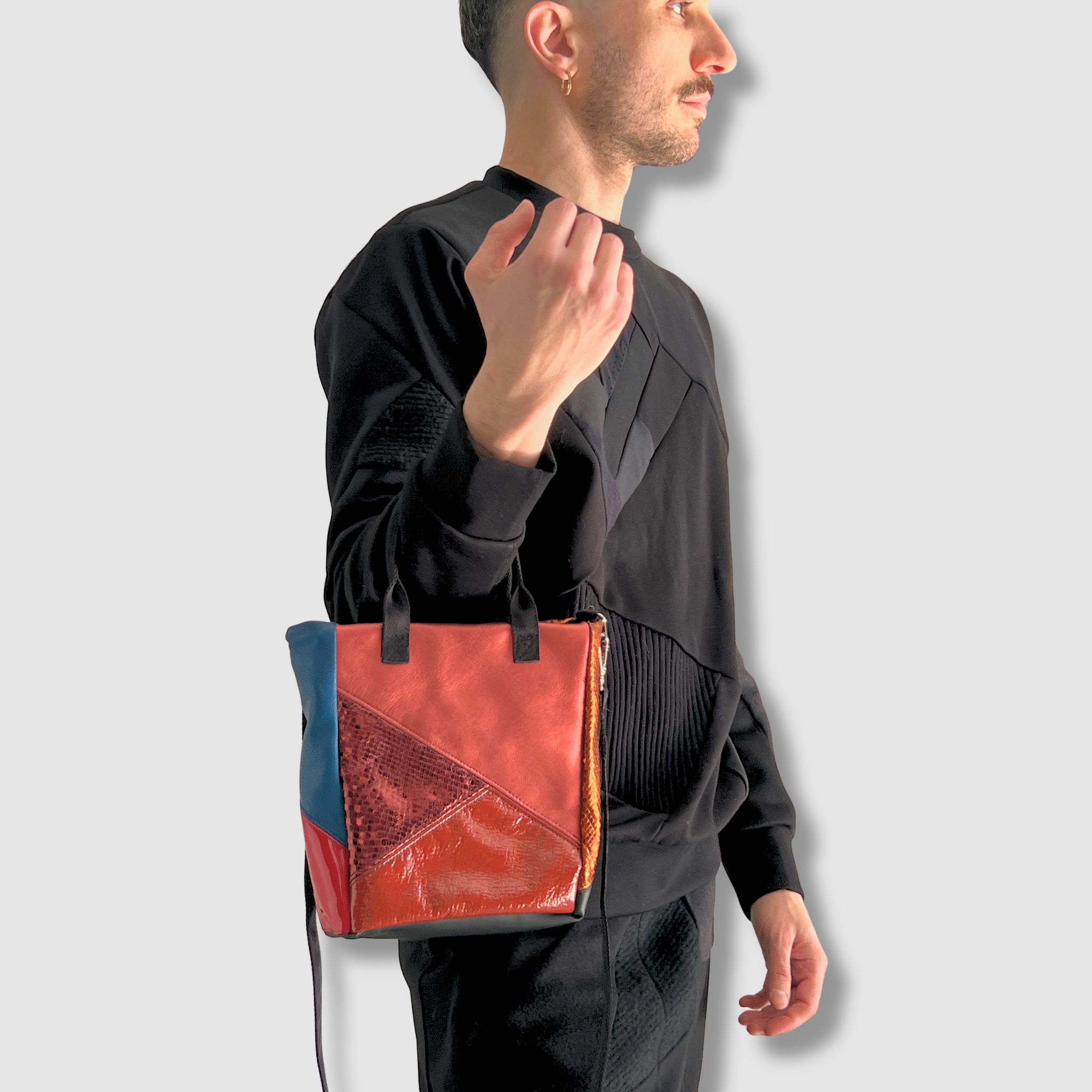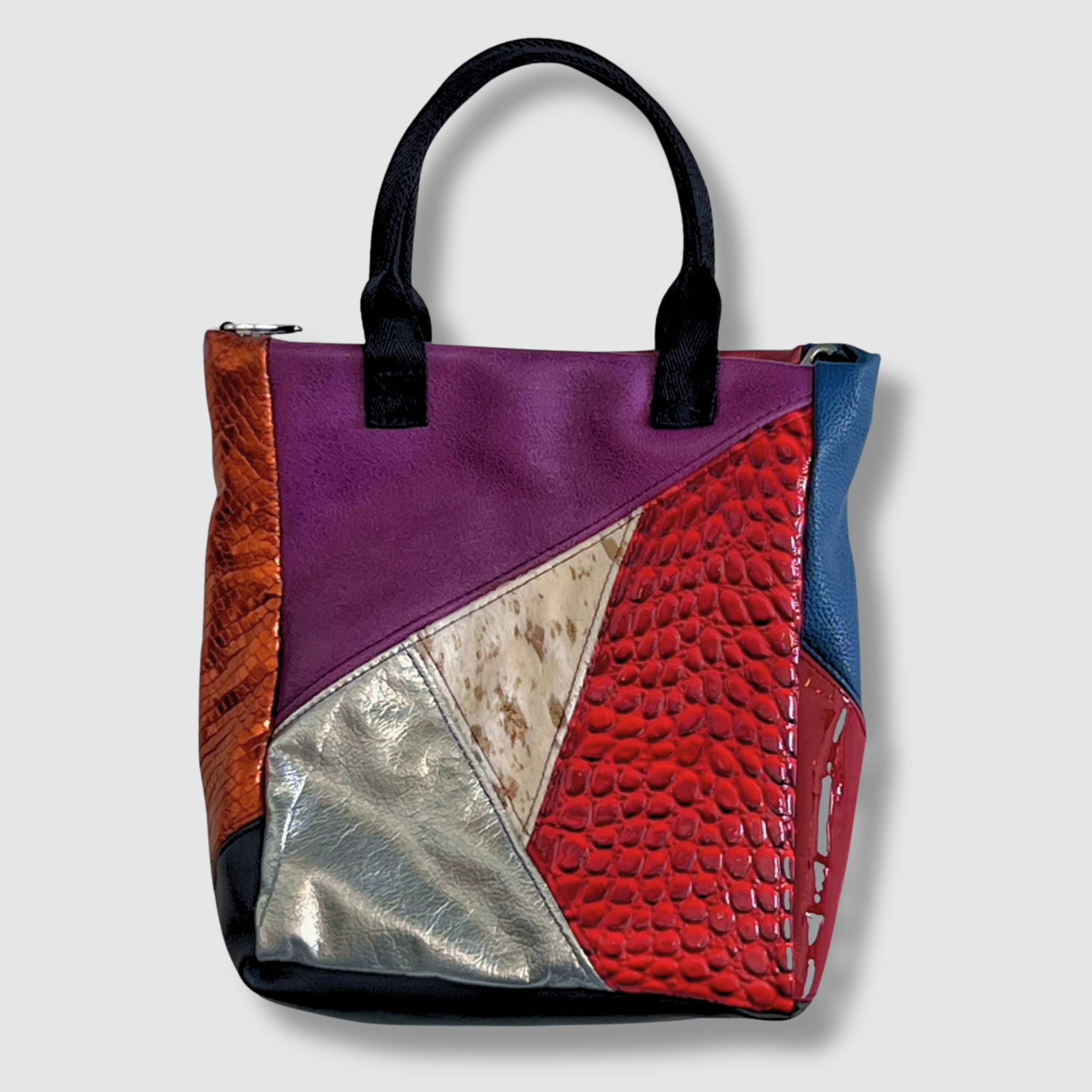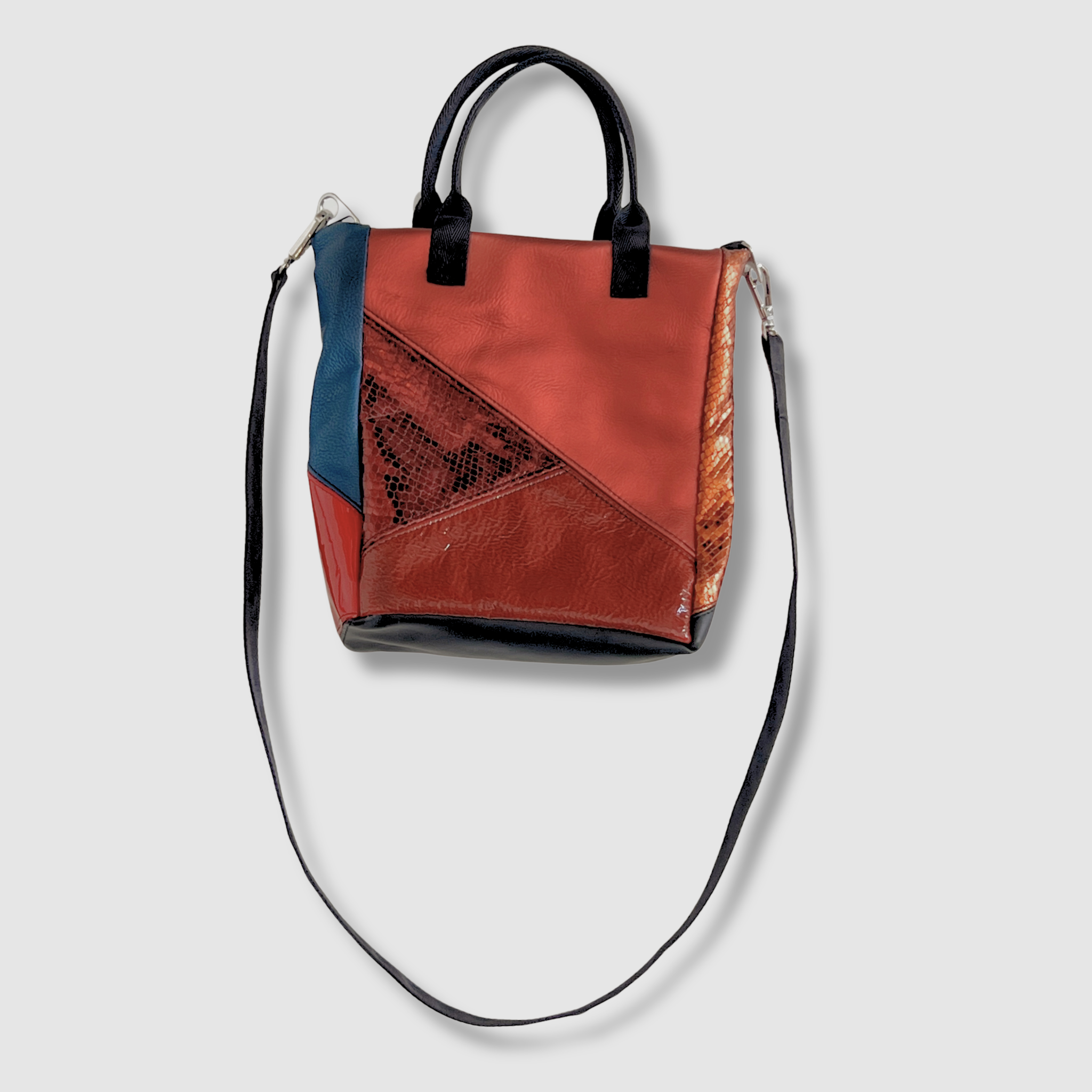 Patchwork exterior in genuine and faux leather