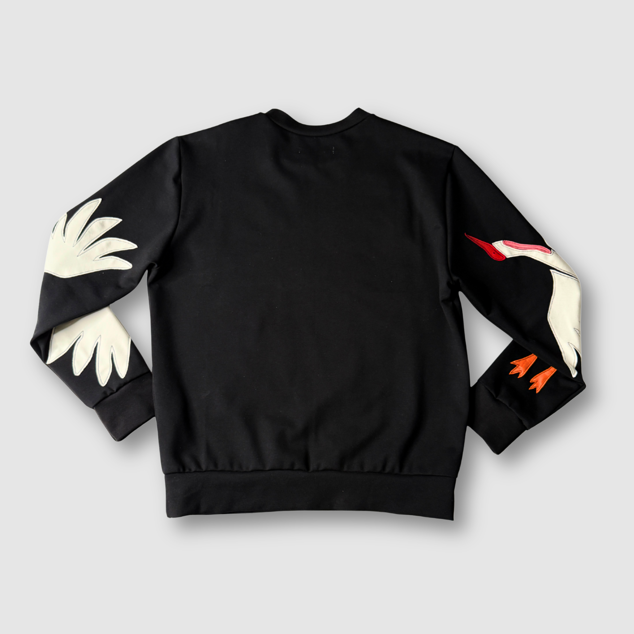 Hand-cut and hand-stitched in Daniel’s signature sculptural style, this stunning crane motif transforms our luxurious black ponte crewneck into a timeless statement piece.